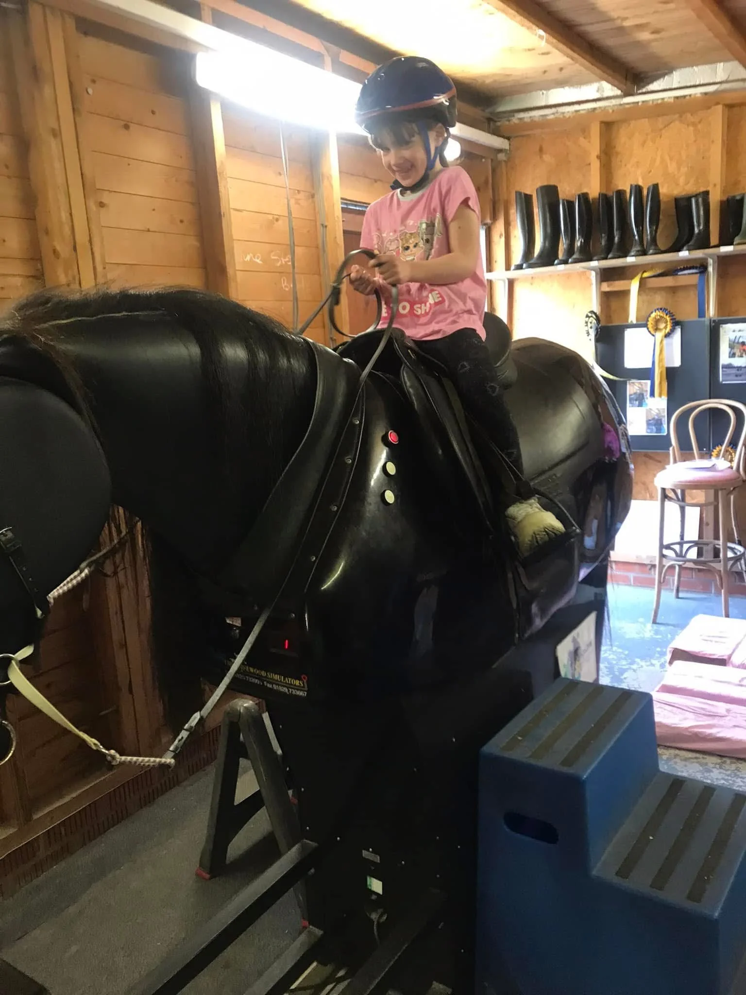 Bob is a life-sized horse simulator who moves just like the real thing. He walks, trots, and canter-cues on command — but he won’t spook, bolt, or nibble your pockets. He’s designed to help you learn the basics of riding posture, balance, and rein handling in a calm, indoor setting.
